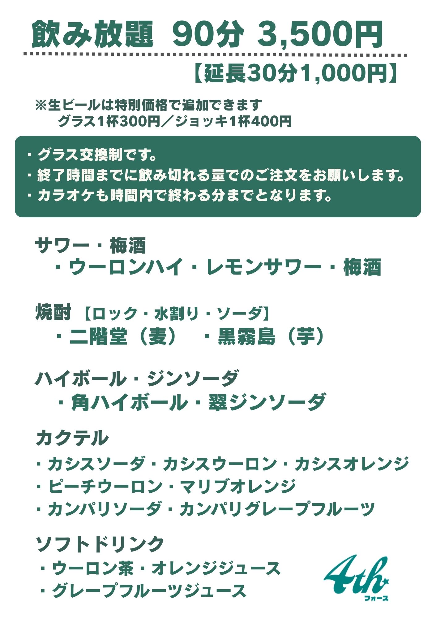 飲み放題 90分3,500円 延長30分1,000円